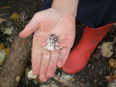 The children were set a task of making a natural perfume/potion. They had to collect and fill an empty film canister with anything they fancied from nature. Smooshing it down and sniffing it. crushing up some fungus They put in some wild garlic too. Being smelly scientists. There was only one lab coat so both boys got into it at the same time :) And sawing, of course... and climbing :)